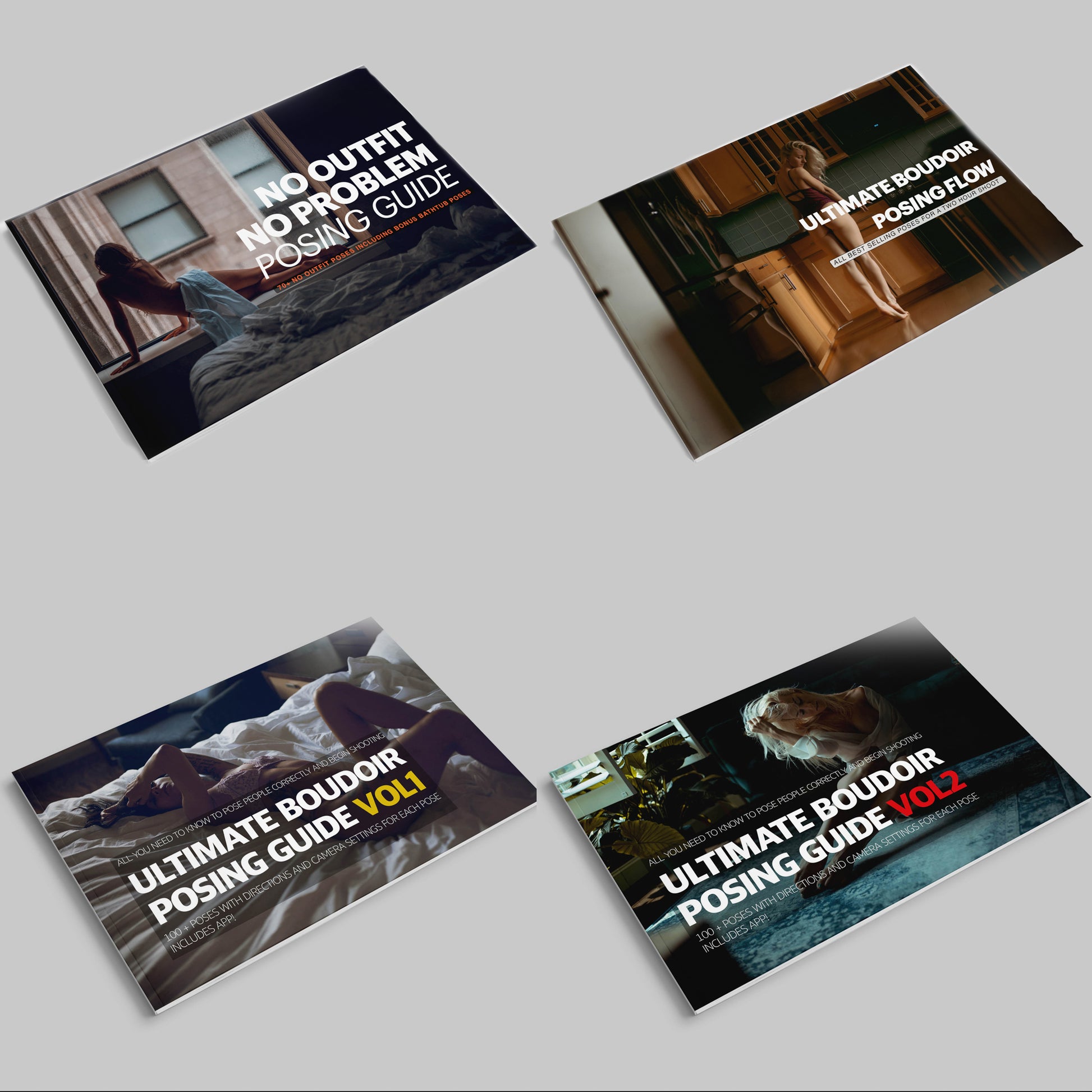 All the posing guides, including the Ultimate Boudoir Posing Guide Vol. 1 and Vol.2, the No Outfit Guide, and the Posing Flow.